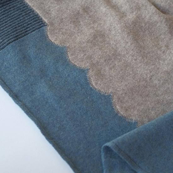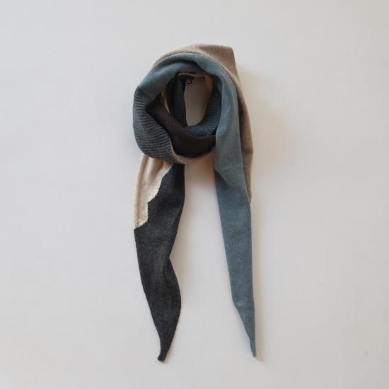 ダーニングという手法でワークショップなどを主宰されている野口光さんのウールニットのスカーフです。数種類のテキスタイルがパッチワークされたユニークなもので、両端は三角形になっています。こちらはチャコールミスト&チョコです。